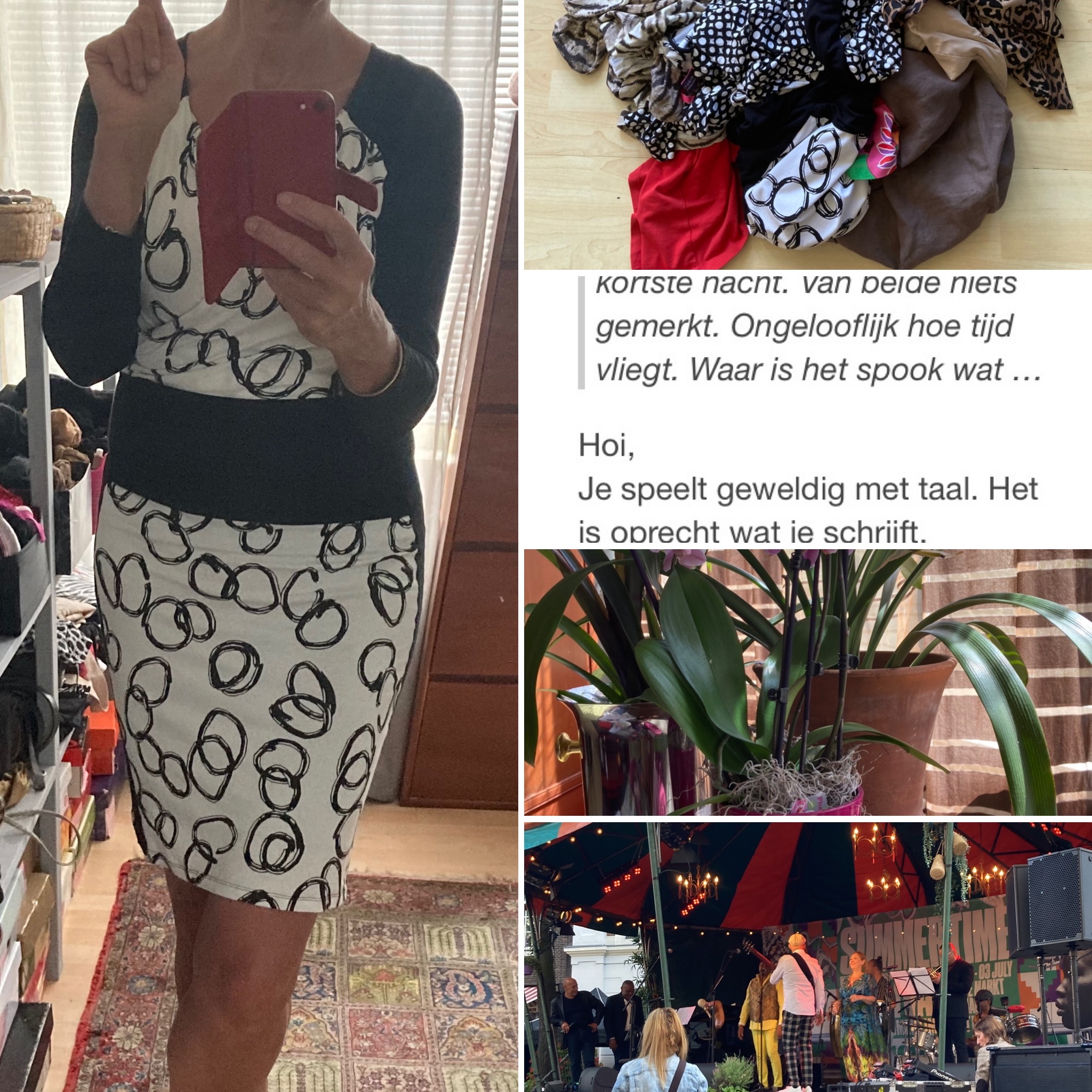 Zo; Mn bed om half vier begroet en ergens iets daarna is jongste heelhuids en veilig thuisgekomen van vakantie. Ik comateus want niks van gemerkt. Heb heerlijk gedanst gisteravond en hoe leuk ook, een matinee heeft mijn voorkeur. De gevolgen van savonds/snachts laat weg en vroeg thuis is de dag erna, of eigenlijk de rest van de dag, als een dooie vogel doorbrengen. Gelukkig zonder hoofdpijn dit keer. Zou het eten van komkommer voor slapengaan dan toch helpen? Oudste komt lunchen en brengt vis mee. Heeft nog wat klussen over de grens voor werk en daarna vakantie. De ene nu thuis en de ander vertrekt. Eten, de vakantieverhalen van jongste en van oudste foto’s van de bruiloft van zijn bestie bekeken. Oudste die, anders dan jongste weinig tot niets geeft om kleren in een mooi pak. Het is fijn met z’n 3tjes te zijn en geeft me zo’n moment dat ik me realiseer uit de scheiding, in de schuldsanering door zijn rotzooi en onvergeeflijke klotestreken van zijn zus ik toch het beste erfdeel heb. Jongste vertrekt naar zijn huis en dingen doen als de kapper, oudste naar vrienden om formule1 te kijken en ik naar de stad. Optreden van een Cubaanse band. De band is niet meer zo gefinetuned als ze waren maar de zon schijnt, de sfeer is goed, er zijn bekenden, dansje gedaan, geflirt en Pizza gegeten met een din en een andere lang niet gezien maar hoe leuk weer. Ik voel me goed.