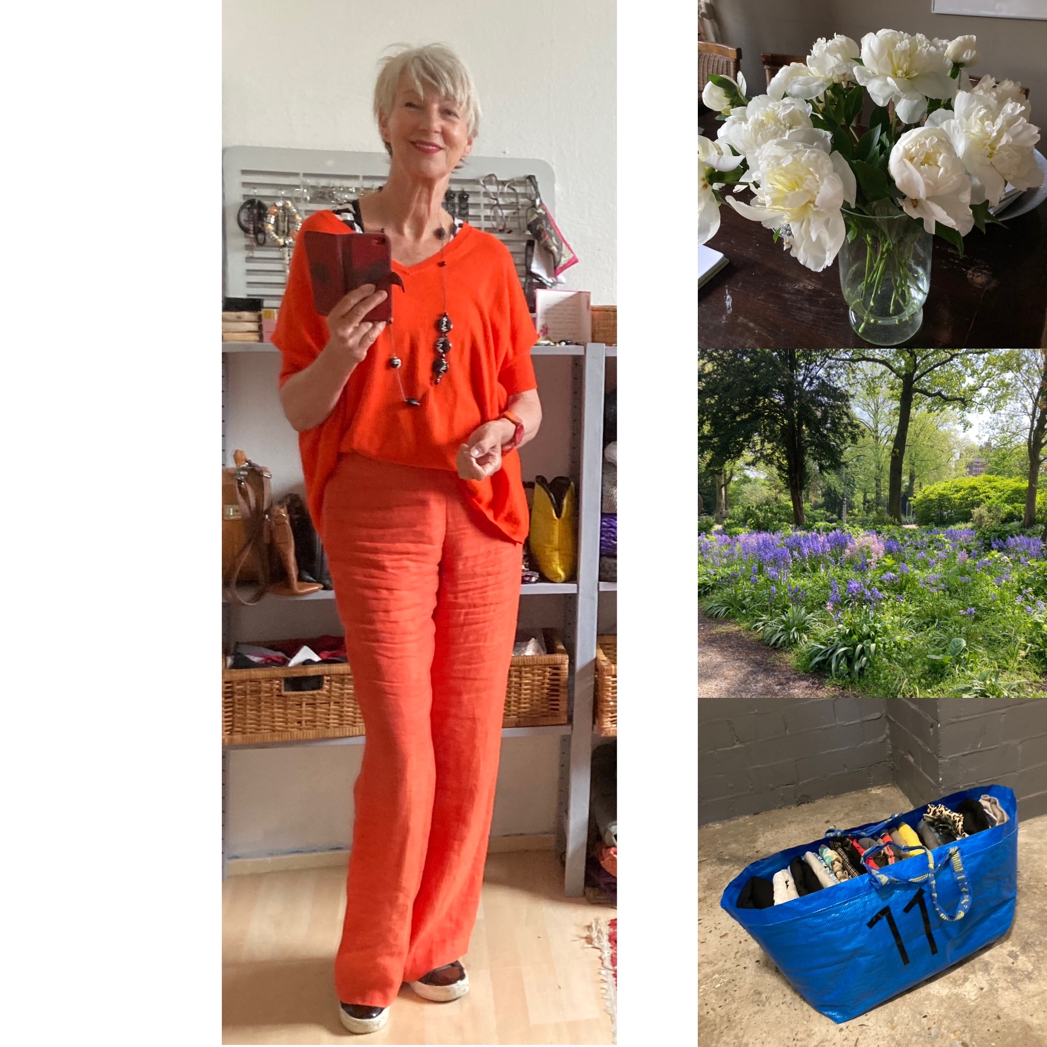 Zondag ; Het plan maar niet afgesproken was aan te haken bij wandelen en koffie met mensen van de Ruimte groep, die ook al heel lang niet gezien, maar din C appte of ik met haar op winkelmissie wilde. Met haar altijd leuk, een doel en terwijl zij past haal ik er van alles bij. C goed geslaagd en ook zij is jarig geweest. Mijn beurt voor trakteren. Little V is smullen en heeft een heerlijk terras. Ik blijf nog wat plakken in de stad, de missie waar ik maandag mee begon is nog niet volbracht en wordt m ook nu niet. Wat ik zie is het net niet of wel maar vind ik te prijzig. De niks film Bed&Breakfast gepakt. Nederlandse romcoms zijn een guilty pleasure -blij dat ik daar geen kaartje voor hoef te kopen met mn PathƩ kaart- en huiswaarts gefietst. Bij Fleuribelli lag een groot pakket niet meer te verkopen pioenrozen die ik mee mocht nemen. Voor mezelf een volle vaas en voor alle buren op het portiek een fijne verassing. Ze staan prachtig en ruiken heerlijk. Net als het songfestival geef ik ook niks om moederdag. Ik blijf er niet voor thuis en als ze zin hebben iets te doen hoor ik t wel. Van 2 dinnen hoor ik dat hun kinderen er niet aan hebben gedacht en zo zullen er vast meer teleurgestelde, verdrietige, niet meer, of was ik maar moeders zijn. Jongste appte of thuis en komt nog even binnenwaaien met een cadeau van hem en zijn lief. Sneakers gekregen en ze komen in de buurt van de missie hahaha. En oudste appt ook dat ie weer veilig thuis is van een weekje bij zn lief in Duitsland. De leukste dagen zijn die met onverwachts fijne verrassingen.